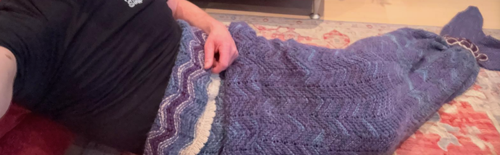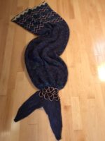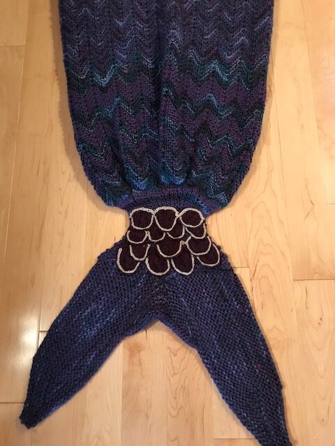 We were talking about an item that I’d concocted with needle and yarn at least ten years ago. My hair stylist commissioned a man-sized mermaid for his husband, Peter, who does costuming in the film industry. Peter was raised in northern England by the sea, and when he was little, he and his friends played on the shore and pretended they were mermaids. So, of course he needed one now in wintery Canada, and why not a hand knit one? Did I mention that Peter is very fussy about fibre and only ever wears cashmere sweaters of the highest quality and choicest colours. That meant I couldn’t rely on remaindered chunky acrylic yarn to knit the creature. No problem; unlike others who’ve asked me to knit for them, my hairstylist understands that quality materials cost money and that there’s value to human labour.