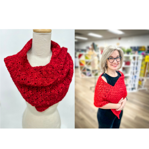• During COVID, while cleaning out my mother’s place, I found some knitting needles. Then while searching for something on the internet, I happened to come across a picture of a knit wrap that was so pretty and off I went searching for details. I found Ravelry in September 2020.  I joined Ravelry, bought this pattern, and ordered the exact yarn that the pattern used.  I am still relieved to have found Very Pink Knits slow motion videos to learn the knit and purl stitches.