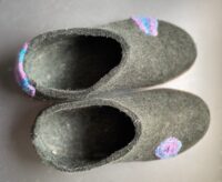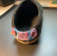 Visible Mending was good news. I love my slip-on felt Glerups but seem to go through a pair a year. The felt thins and open holes appear on the outside of the slippers at the front. The backs also break down from the motion of my feet going in and out. So, prompted by Arounna’s presentation, I wondered what would happen if I fixed my slippers with unapologetic patches. Take a look.